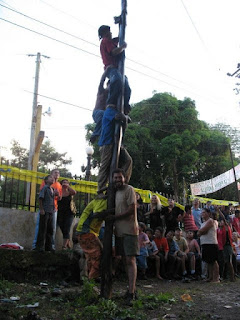 Cuando unos 8 hombres se lograron organizar llegó un niño -quizas de unos 7 años- y comenzó a trepar sobre todos, ver a un niño de esa edad colgado a 6 metros de altura puede dar una angustia un tanto desesperante para cualquier urbano, pero nadie pareció darle la mayor importancia, todos los presentes gritaron y dieron vitores para que el niño alcanzara el premio pero no lo logró, todos lo apoyaron, incluso los borrachitos -excepto uno que le dio por trataba de ayudar pero más complicaba las cosas- todo el show duró por lo menos una hora y media,